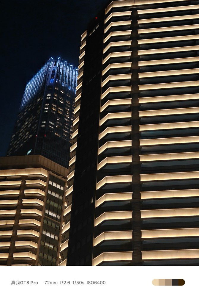 夜间拍摄时,通过16合1像素合并技术形成2μm大像素,提升进光量,拍摄夜晚建筑时,细节丰富,画面纯净,无明显炫光。