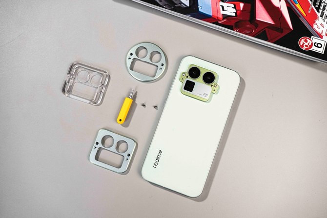 真我GT8Pro在外观设计上最引人注目的突破,在于打破了当前旗舰机“非方即圆”的固化思路,推出行业首创的机械拼装镜头模组。这一设计并非简单的装饰性元素,而是让用户能通过“拧开螺丝—更换Deco—拧紧螺丝”的三步操作,自由切换经典圆形、金属舷窗、机能罗伯特三种基础形态。