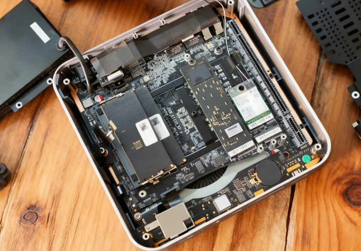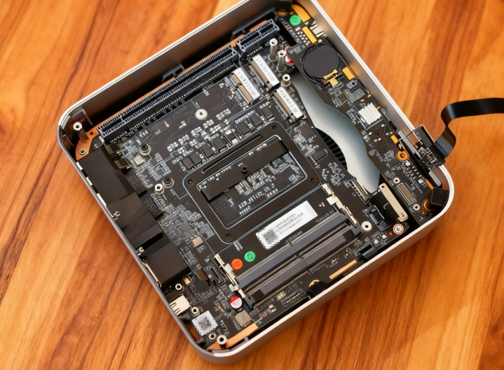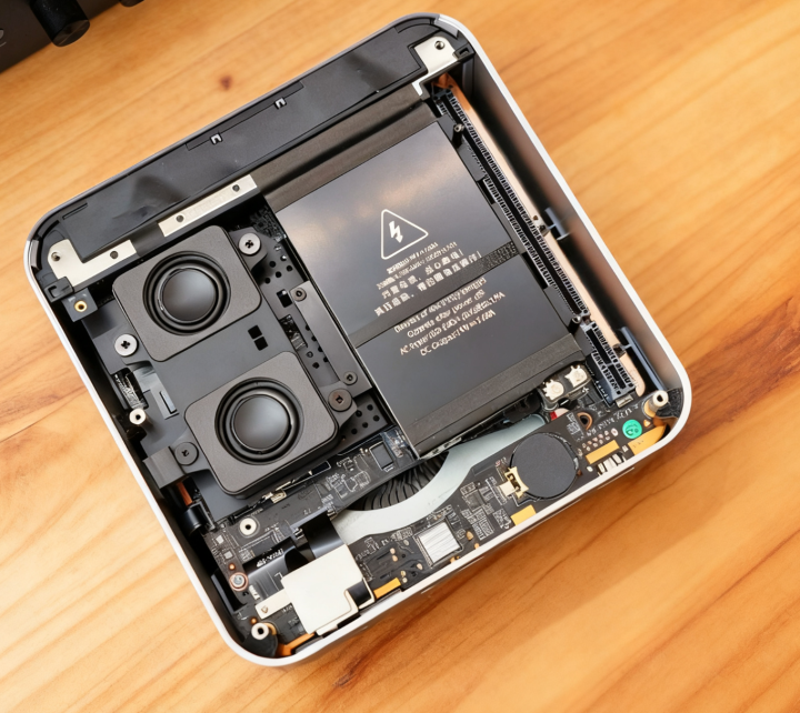 接下来,就能看到迷你主机的硬盘和内存插槽了,这个也是很多人关心迷你主机拓展性的重要接口,市面上大多数轻薄本都是板载内存,可以看到零刻GTi15 Ultra采用的是双通道内存插槽,标配了两根镁光 DDR5 5600MHz 16GB×2(共 32GB),硬盘是双盘位,主盘位标配的也是大厂英睿达 CT1000P3PSSD8 1TB的硬盘,后面可以自己再加一根硬盘,两个插槽都支持最新的Pcie4.0协议,官方还有 64GB+1TB 版本可选。当然,也可以自己升级,可以换两根32G内存条,升级64G内存,硬盘可以加2TB的硬盘,都可以,拓展性很强,另外小主机的cmos电池也能更换。
