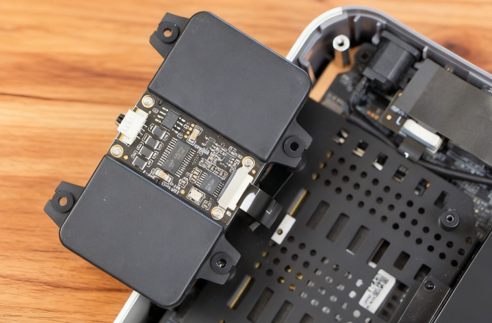 简单拆个机,其实拆机不难,找个手机的卡针,把底部的四个脚垫取下来,拧开四颗螺丝就可以打开底盖了,打开后先看到金属防尘网,这个设计很好,因为底部是唯一的进风口,有了这个0.8mm 直径小孔的防尘网,能做到防尘不挡风,长时间用,不怕机器内部积灰。