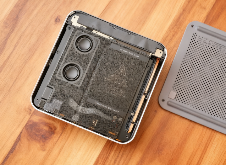 取下来四颗防尘网,再拆音箱和电源,没错,这个小主机内置了145W的 内置电源,并且还放了两个4W的扬声器,音质很不错,比大多数显示器带的喇叭效果要好很多。